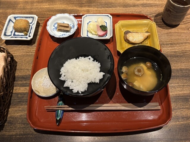 静岡産の新米を主役に、鰆の幽庵焼き、野菜のコロッケ、蓮根のきんぴら、香の物、味噌汁。