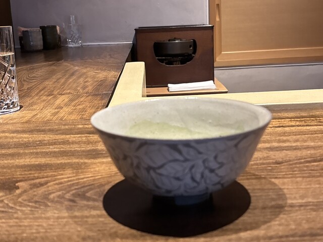栽培した自然薯をメレンゲ状にしたものの上に、生のカラスミ、炙った山芋の皮、わさびが乗ってて、周りにとろみを効かせた出汁。