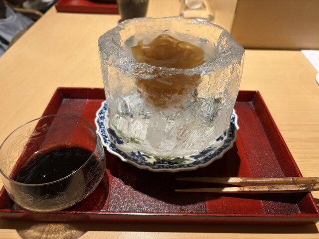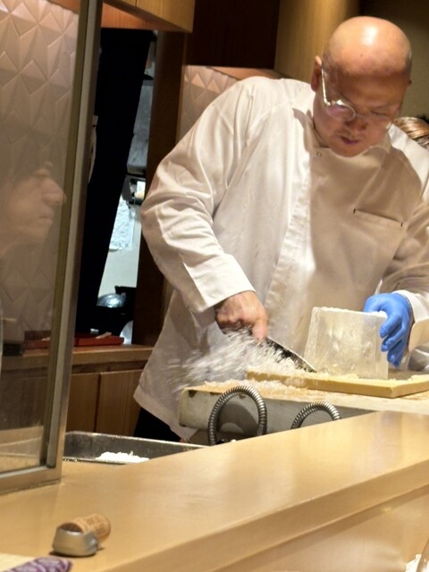 食後の葛切りの器は大将が氷を一個づつ包丁で削るパフォーマンスもあり、なんて贅沢な器^ ^