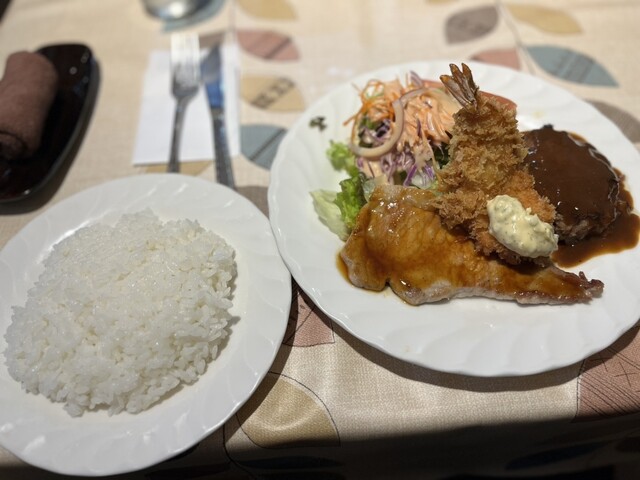 ただ、車屋さんにきてるからビールは飲めないわ いつもの様に グリルランチ1100円を まずはスープ ポタージュですね 美味しい♪ ライスとお皿が提供されます 豚の焼いたの エビフライ ハンバーグ 野菜もたっぷり 私はハンバーグが一番だな ご馳走様でした