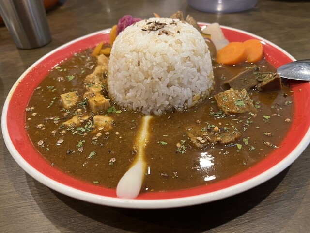 着皿 おーキレイ ビジュアルが際立ってますね つけ合わせの野菜も丁寧に ビーフとチキン、カレーの分け目はマッシュポテト、ザワークラウトのキャベツもスッキリ、にんじんは柔らかくホコホコ、ジャガイモ、カボチャ、さつまいもも箸休めに良い、写真じゃわかんないかも大根のお漬物もいいなー カレールー大盛もありだな、少し辛いでもいただける気がします