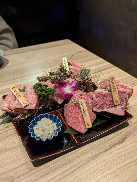 牛タン焼、牛タン煮込み、本日の厳選野菜焼アスパラとシイタケ、青唐辛子辛味噌漬け