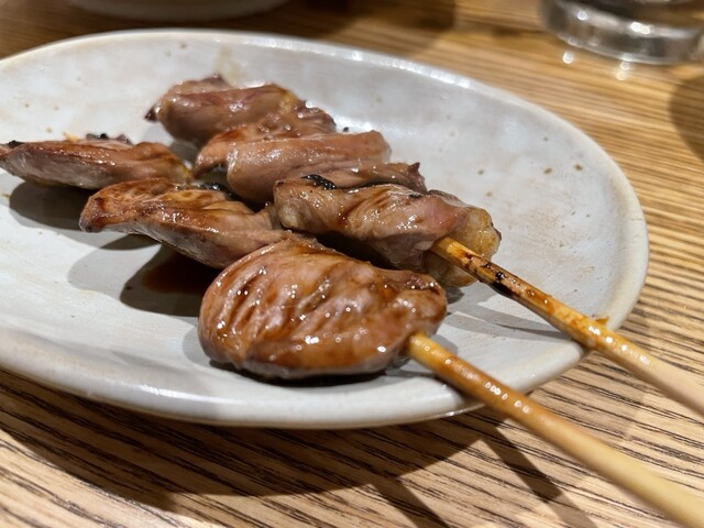 左から鶏モモミ(タレ)、鶏皮(塩)、ぼんじり(塩)