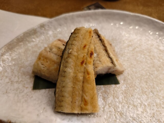 うなぎ白焼(まずは野菜から焼いて白焼は一度火が通っているので皮面から)と丁寧な説明、薬味もタレ、塩、わさびと三種類の味が楽しめます(私的にはわさび)