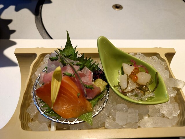 花かご旬菜盛り(旬菜三種、刺身二種、茶碗蒸し)どれも見栄えが美しくイチローズモルトハイボールが進みます(笑)