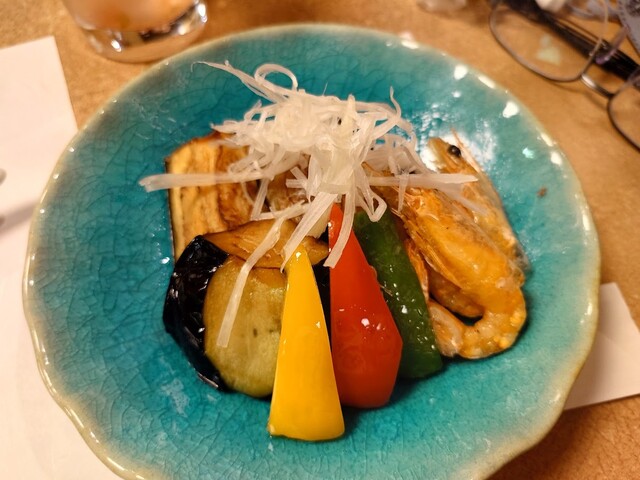 冷鉢(冷やし煮物)海老、小柱、椎茸、等盛りだくさんで大満足