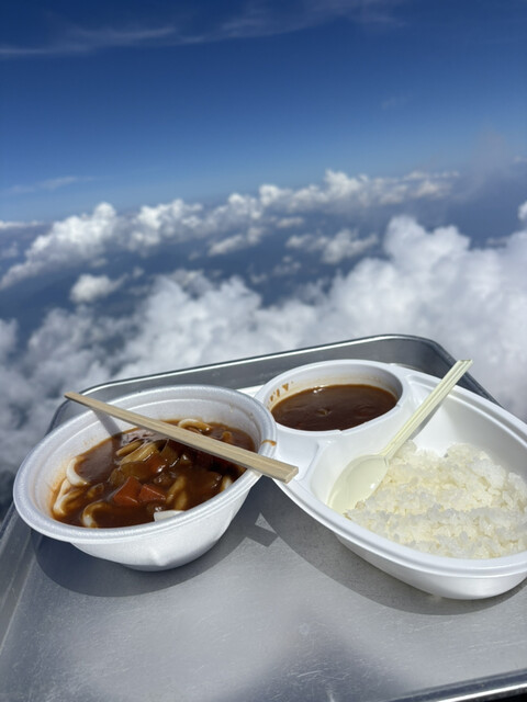 富士山の頂上にある「扇屋」で食事をした。提供されるのは、カレーライスやカレーうどんといった何の変哲もない定番メニューである。しかし、この場所で食べるそれは、単なる「食事」という言葉では収まらない。