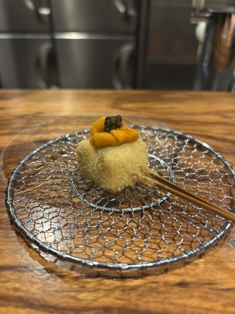 おまかせで運ばれてきた串は17本。一本ごとに異なる表情を見せ、フォアグラやフィレ肉の濃厚さに舌を喜ばせ、野菜の瑞々しさにほっと安らぎを覚える。そして頂点に立ったのは「寿司の串揚げ」であった。揚げられたシャリの香ばしさとほろりとした食感、そこにネタが寄り添うことで生まれる一体感――その瞬間、この店がただの串揚げ屋ではないことを思い知らされた。