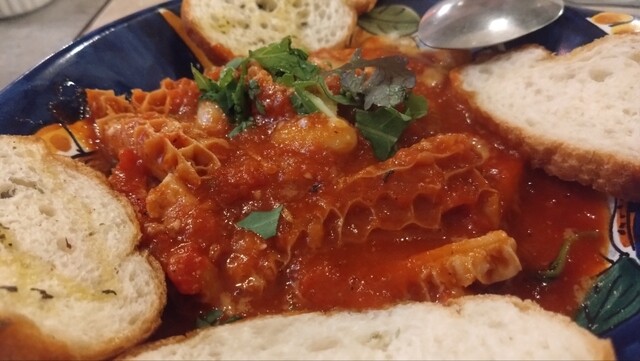 少し重めの赤には「トリッパと4種豆のトマトソース煮」と「豚肩ロースのモッツァレラチーズ入りカツレツ」、「ペンネゴルゴンゾーラ」を。