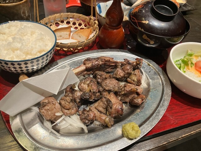 ・地鶏の炭火焼き:炭火焼きの定食って意外とないから、お酒なしでもこれが食べられるの嬉しい☺︎お皿の通り、1人前でも山盛り。骨付きが乗ってるのも本格的で気分あがる!