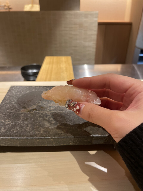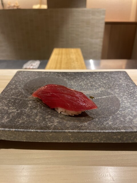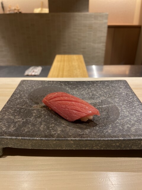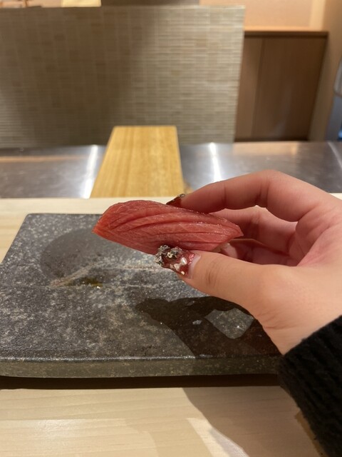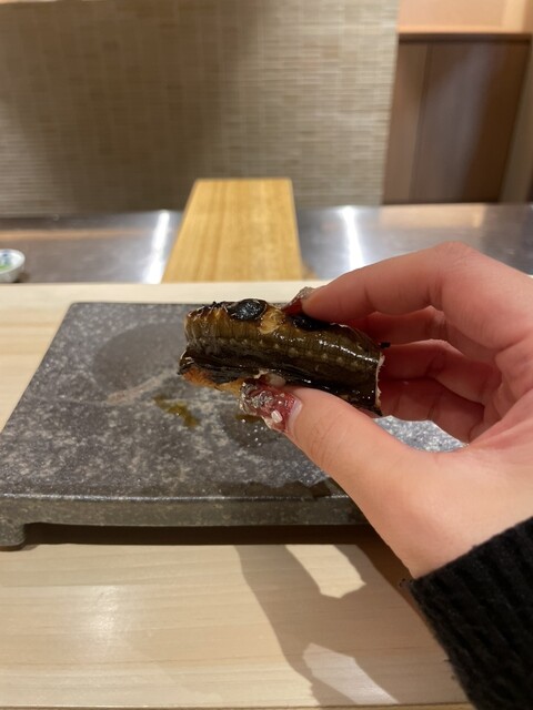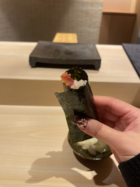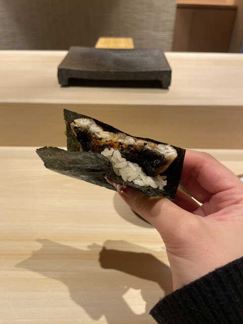 メヒカリは少し燻製されており、機械を使わず炭と藁で当てるだけの調理が、優しい味と香りがマッチして美味しかった。佐渡のアオリイカは、塩とかぼすで味付けしてあり、さっぱりとした旨さが、コースの抑揚を感じました。さらに、北海道ウニの海苔巻き。濃厚なウニに巻き立ての海苔がうまい。ちなみに、海苔は味をカスタムしているらしく、お鮨に合うようチョイスしているとか。鰻の海苔巻きは、関西風の焼き方で仕上げているとのことで、香り高く美味しかった。アナゴも大将のこだわりで、皮はパリっと身はふわふわに仕上げており、日本一のふわふわを目指しているらしい!美味しいのでぜひ食べて欲しい♡お鮨最後は、トロタクで、手渡しの海苔巻きがとても美味しかった。