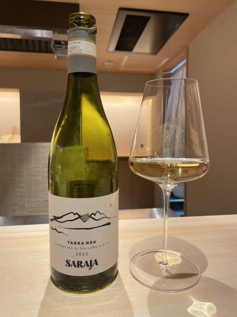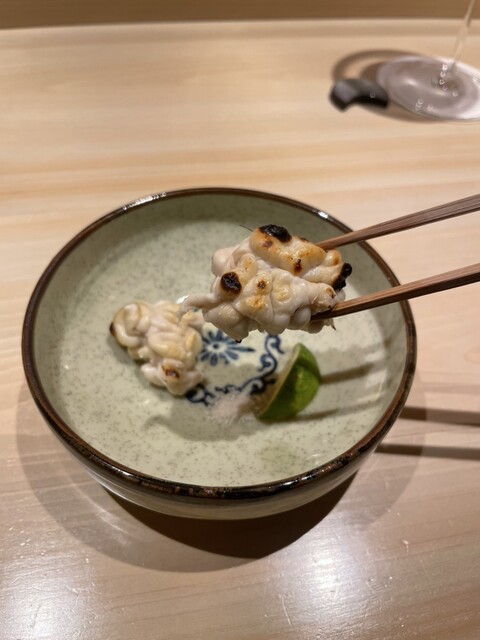 さらに、北海道根室の焼き白子のかぼすと塩添えも頂きました。とろっとろの白子が最高でお酒が進みます。お酒は、1杯目にシャンパンを頂いたのですが、「Michel Genet」のシャンパンが美味しくてボトルで飲みたくなりました✨️