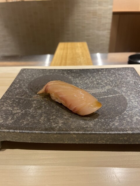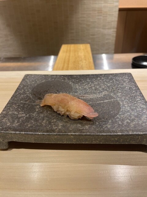 さて、ここからお待ちかねのお鮨に。まずは、鱗焼きで頂いた愛媛の白甘鯛。旨みがしっかりのっており絶品。次に食べたカワハギは、間に肝を入れて握ってあり美味しい。次の鰆も産地直送で、新鮮かつ握りたてで美味。ここらで白ワインを追加。飲みやすいシャブリを。お次は、延縄のマグロでした。宮城気仙沼のものを使っており、しっかりの味としみた味付けが素晴らしい。さらに大トロ。旨みがしっかりのっていて食べ応えも抜群。次のイワシは、大将のこだわりで、朝仕入れたものしか使わず、時期直前にひらいて骨もとるとのことで、新鮮なうえに厚めで旨味が凝縮されていて絶品でした。