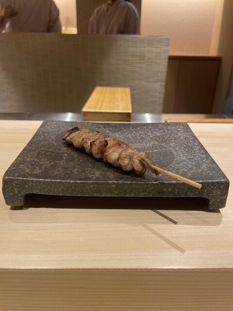 次に、アナゴの天ぷら(山椒ぞえ)を頂きました。朝しめたてのアナゴを使っており、上からアナゴで取った煮詰めがかかっていてこれも絶品。お次は、くりからという、鰻の串が登場。塩で味付けしただけなのに、しっかり味が付いていて素材の美味しさも残した1品でした。
