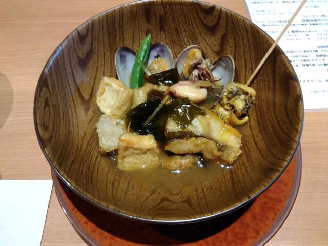 「アブラコの揚げ出しブイヤベース」これは少し胃に不安を抱える私達にも優しい一品。いい出汁が幸せ!アブラコの美味なのは勿論の事、揚げ出し豆腐もふんわりおいしい仕上がり、とろとろの白ナスもつぶ貝もブイヤベースに合う!めちゃウマでした。
