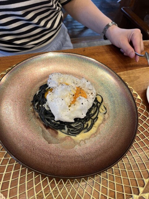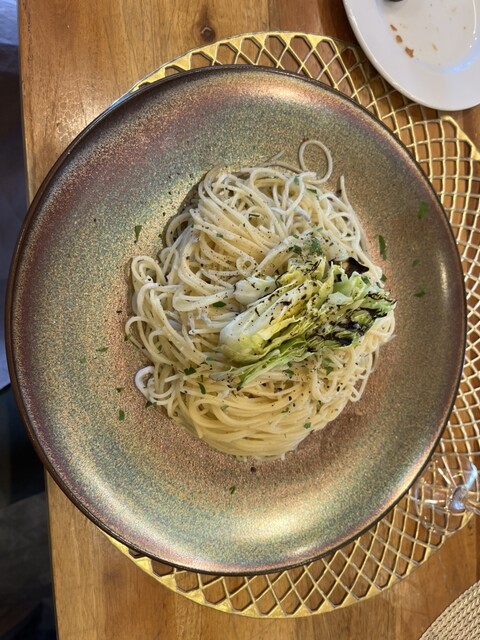 パスタは春キャベツのペペロンチーノと、イカスミ。イカスミは練り込まれてて歯につきません。