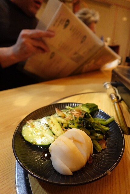 お通しのお肉とお漬物も山盛りで、満足感がとってもありました。全体的に味付けは濃いめなのでドリンクが進みました!