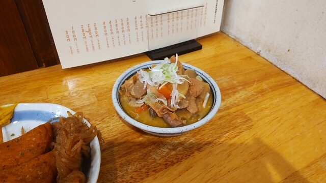 黒おでんて何?と期待して、おでん盛りともつ煮込みとを注文。特別メニューにあった山芋のポテトフライも!