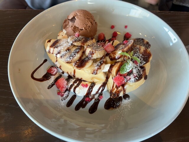 息子はデザートメニューから「ハーフワッフル」を注文。ハーフサイズとのことでしたが、写真の通りかなり大きく、ボリューム満点!バナナとチョコソース、アイスが盛り付けられ、見た目も華やかで子供も大喜びでした。モーニングの時間帯から本格的なデザートまで楽しめるのは嬉しいですね。