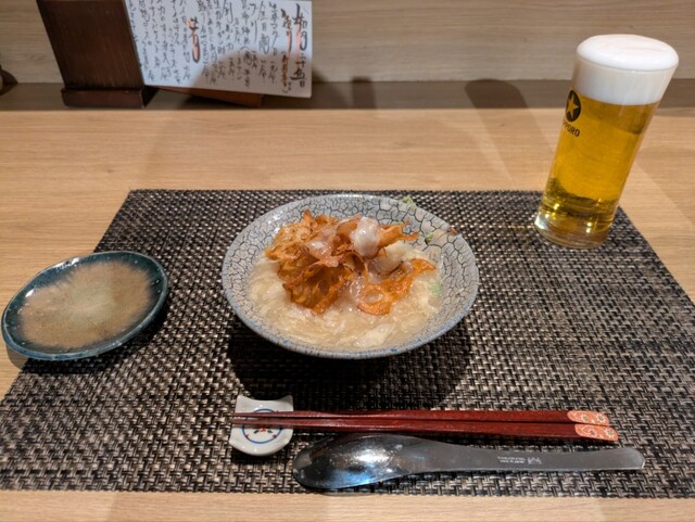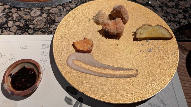 その時期の美味しい食材を、コースのみで提供されています。魚介類はもちろん、野菜類も各産地逸品の 家庭では手に入ら無い食材ばかり。大抵最初はお刺身から始まり、今回は蒸しアワビの肝和え、ズワイガニのお刺身...