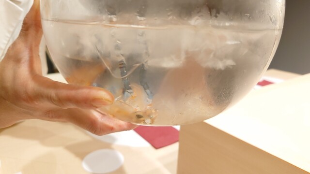 卵黄の一部を注射器で抜き、余った部分にタレを注入。