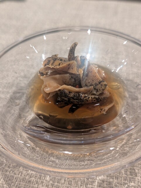 紹興酒とヴァン・ジョーヌに漬け込んだつぶ貝に、柚子オイルを