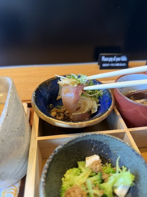 この日の小鉢は【天然はまちといぶりがっこのカルパッチョ・揚げ餅のきのこあん掛け・ブロッコリーとクリームチーズの胡麻和え】でした。