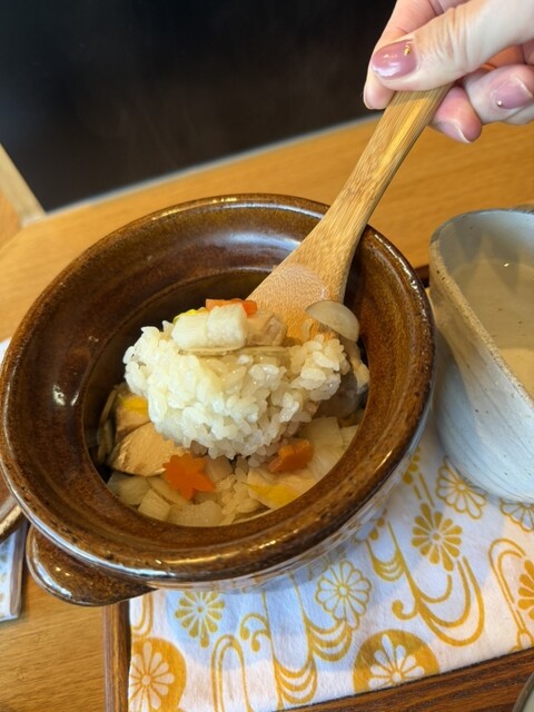 ご飯が本当に美味しくて体に沁みわたる感じがします✨食べ進めるとおこげがある部分があったりと、土鍋ならではの楽しみもあります。