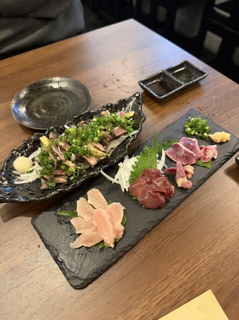 鶏のお造り盛り合わせはささみ・きも・こころ・ずり・ずりのえんがわ!ずりはごま油で、その他は九州の醤油でいただきますこの甘さが、鶏にすごく合ってて美味しい‼ずりのえんがわがコリコリっとしてて好きでした✨