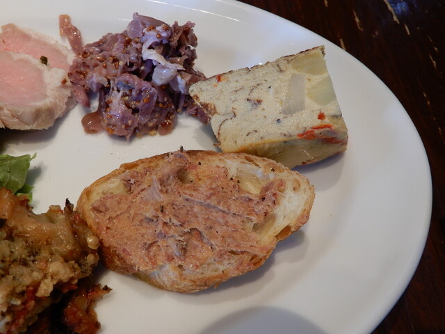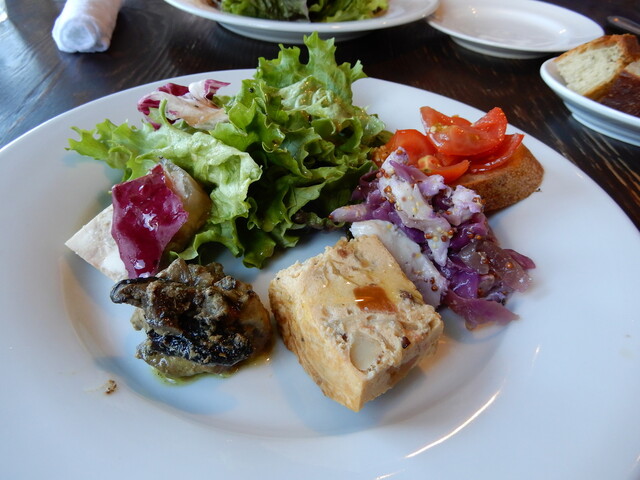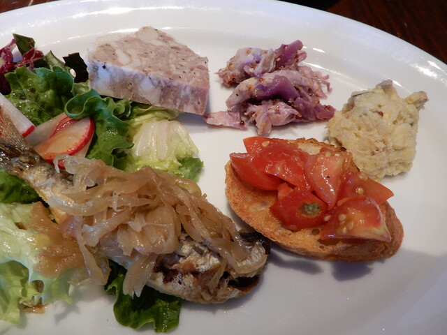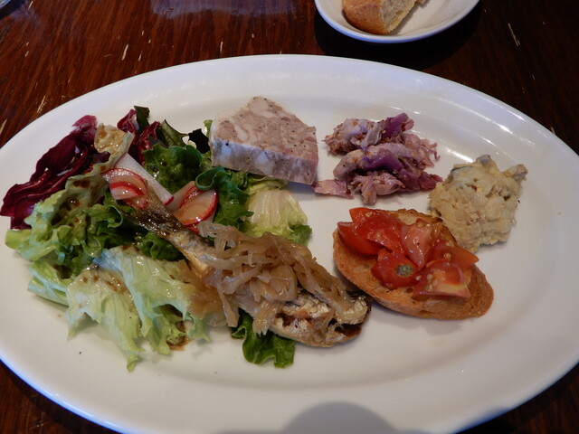 いつものかわいい店員さんに招かれてお店に入り、話し合いの上用心してAをオーダー。前菜3種(Bは5種)は定番の美味しいオムレツとほか2種、鶏むね肉とポテトのサラダが酸味が効いた味で印象的でした。