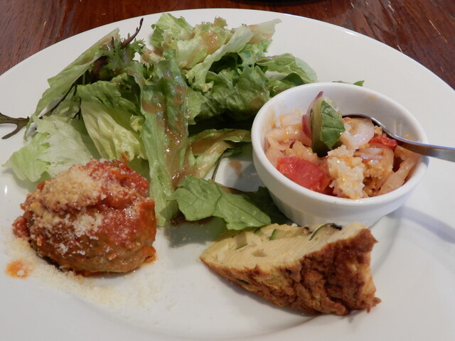 前菜3種は、パンと玉ねぎなどをマリネしたサラダ、オムレツ、ミートボールです。サラダは甘みが効いており舌を喜ばせる前奏曲、オムレツはいつもの味、ミートボールはスパイシィで風味良く美味しく頂けました。