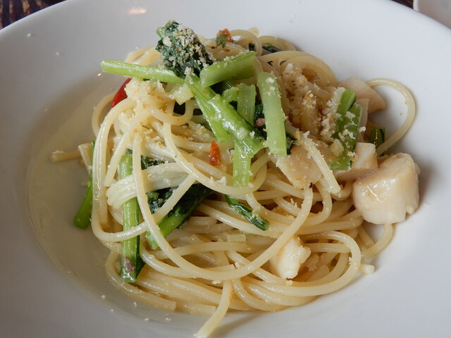 パスタは(経験による勘ですが)Aは多めで、品数の多いBは少なめになっているように思います。私はいつもトマトソース系を頼みますが、今回はホタテに惹かれてアーリオにしました。いざ来てみると、シャキシャキの小松菜と大きな甘いホタテがゴロゴロ入り、ニンニクも控えめで最後まで飽きない味に仕上がっていました。