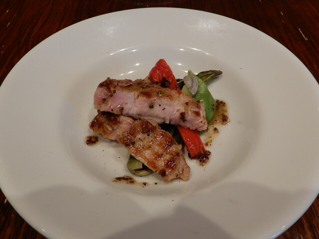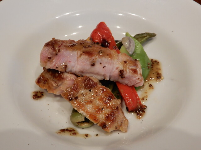 パリッとしっかり焼きの入った皮の香ばしい味と香草の風味が鶏モモの味を引き立てます。五感で味わうメインでした。