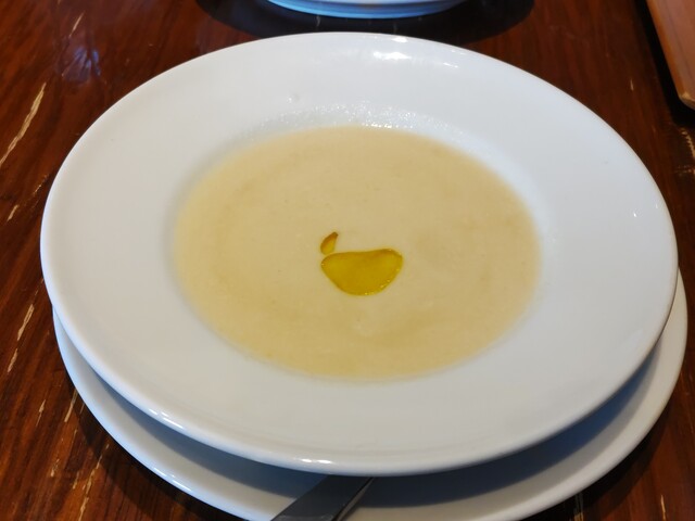 スープは夏らしくジャガイモの冷製仕立て、ジャガイモの旨味を引き立てクリームの風味と相まって旨い。お皿までよく冷やしてあるので最後までひんやり美味しい。