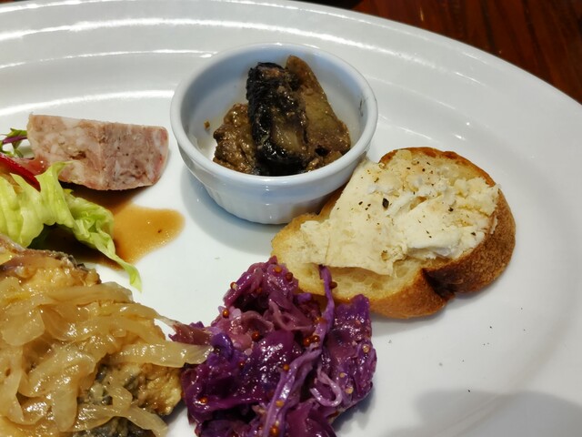 Bコースの前菜は5種、自家製ハム・紫キャベツと鶏のマリネ・ブルスケッタ・甘めのフリッタータ・茄子のグラタンでした。