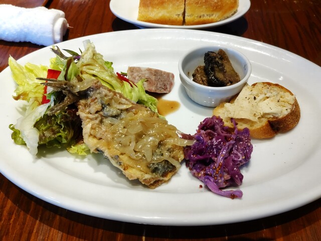 サラダはいつも通りバルサミコの風味豊かなドレッシングで食欲をそそります。5種の前菜は少しづつ内容が変えられて見るのが楽しみです。今回、イワシのフライ(中央下)が海の香りで美味しい。スモークした魚のポテサラ(右端)も燻製の香り豊かで美味い一品。