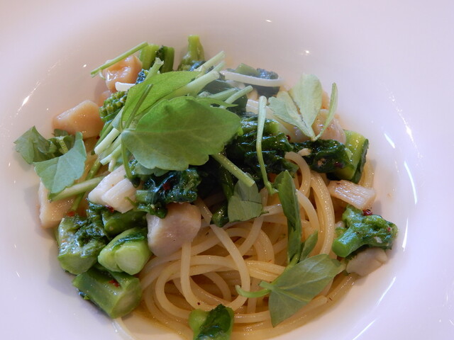 客数が少ないので、待ち時間も程々にパスタが到着です。私が(春らしく)菜の花と貝柱のオイルパスタ、助手席様が小松菜とエビのトマトソースです。オイルパスタは、ほろ苦い菜の花の味に合わせて少々濃い目の塩味で、まろやかな貝柱と合わせて頂くとちょうどいいお味です。ソースがタップリ目で結構お皿に残ったので、フォカッチャに絡めてすべて賞味しました。素材の旨味をすべて吸っていて、ふき取って味わうのも楽しみの一つですね。