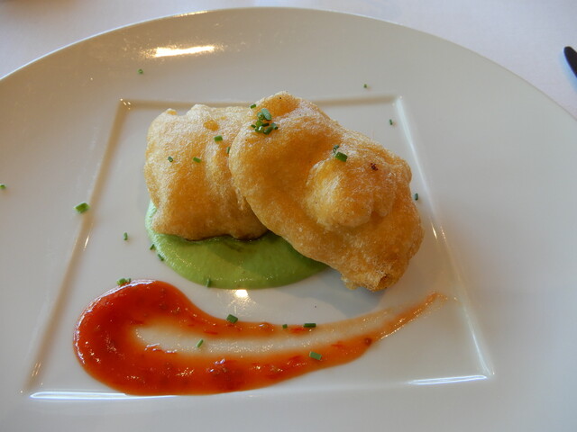 つぎの前菜、鱧のフリットは小骨が多いはずなのに鰻をサッパリさせたような旨味を閉じ込めた軽いフリットで、濃厚なソースがよく合いました。助手席様のサーモンも夏らしいサラダ仕立てです。味は知りませんが・・・(笑)