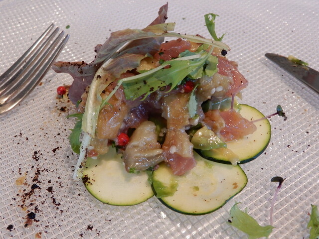 前菜は、焼きナスとマグロのカルパッチョと海老のリゾットでしたが、二人ともカルパッチョを選択。これも美味しく、ほんのりスモークされたマグロと柔らかく焼かれたナスが溶け合い、「何味?」というど控えめの味付けで素材の持ち味を十分生かした一皿です。