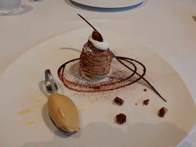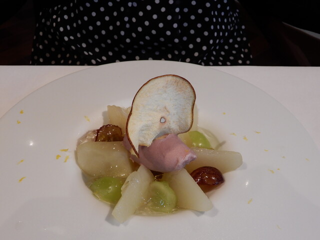 ボチボチお腹いっぱいのところに、別腹のデザートが来ます。モンブランと梨のコンポート・4種盛りの3種類から選べますが、4種盛りはAコース専用なので(美味しいですが)できれば印象に残る本日のデザートを・・・と思います。