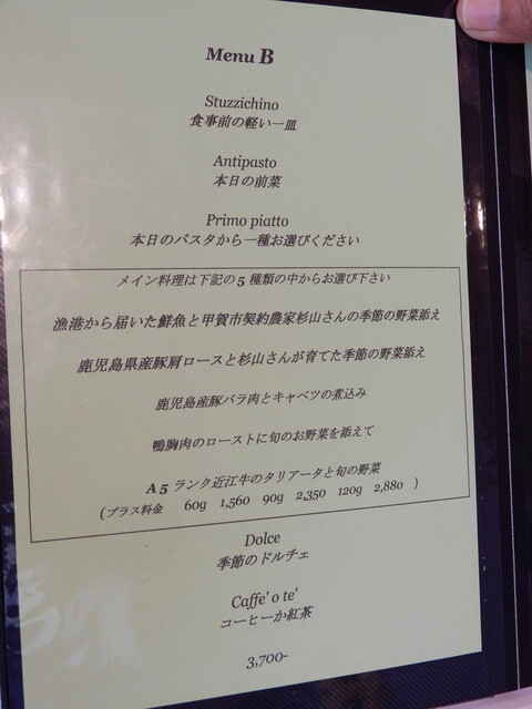 コースは前菜・メイン・パスタ・デザートが選べるBにしました。