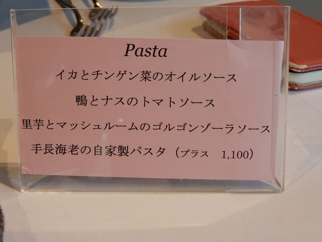 スープは、カリフラワーのポタージュとかぼちゃのハニーナッツ、前菜は白子ののソテーと赤エビの料理、パスタはオイル・トマト・カルボナーラから選択、メインは写真のメニューにある5種から・ドルチェは3種類から選択です。店内における臨時「井戸端会議」を経て、すべて平和に決定!!!(笑)