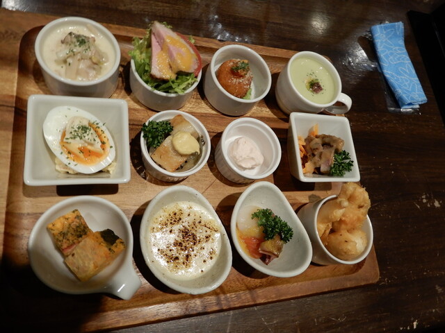 しばらくして、「12種のプレート」と前菜が到着。見た目もかわいいですが味もなかなか美味しく、ほんのりカレー風味のフリッターやポテトサラダなど味も食感も変化があって、これいいですねぇ~。