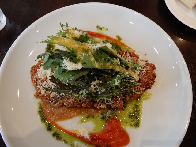 続いて私のメインが到着。これが写真のとおり結構なボリューム!で、厚目の衣が鶏の旨味を上手く閉じ込めており、ランチには贅沢な一品です。トマトソースを主体に3種類のソースが絡まって、深みのある味です。