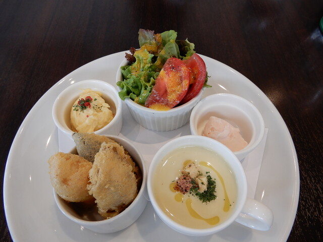 スープはゴボウのポタージュで、ゴボウの風味が程よく感じられ結構おいしい。付け合わせは、グリーンサラダ・玉子サラダ・キャロットラペ・野菜のフリットです。少しづつついているので飽きずに食べられて美味しい。特に野菜のフリットは少々カレー風味で揚げたてパリット感があり、野菜の旨味が引き立ちます。