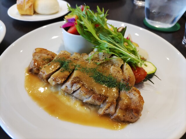 メニューをみて、私はメインプレートから「養老豚ロースのポアレ」を、助手席様はパスタランチから「海鮮と大葉のペペロンチーノ」を選択しました。
