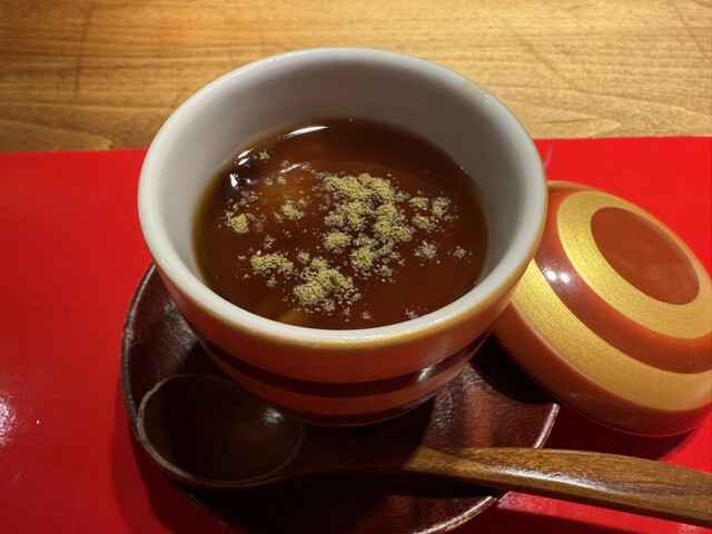 お凌ぎはアワビのしゃぶしゃぶの入った素麺でもちもちと食べ応えもあり浸したお汁が美味しくて全部飲み干してしまいました。煮物はつくねのキノコのあんかけ、焼物は味噌漬け牛肉のステーキとどちらも満足する美味しさでした。ご飯の前にもう一品出していただいたのがひつまぶしをイメージしてみたという茶碗蒸しであおさやわさびがよく香りなかなか美味しかったです。ご飯はお得意の土鍋で炊いた炊き込みご飯にのどぐろを炙ったものが載せてありそのままでも美味しくだし汁をかけるとこれがまた絶品でした。香の物にはお漬物に加えて名物のいぶりがっこのマスカルポーネチーズ添えが付いていました。