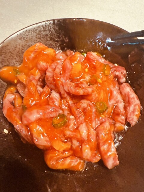 折り畳んだお肉をタレのかかった卵黄につけて食します。