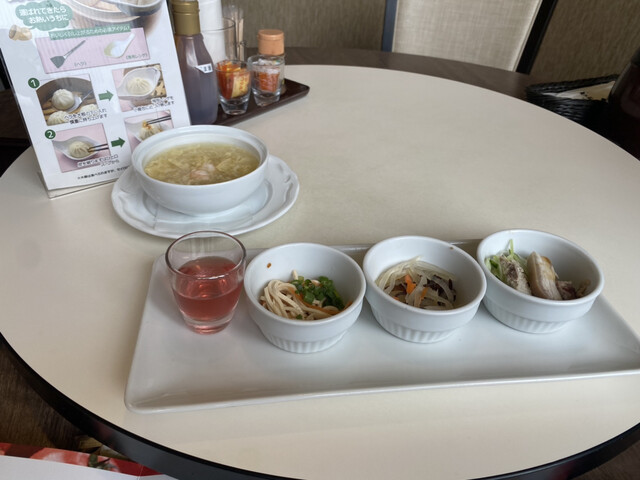 前菜3種と食前酒もどきなどなどこれがあるんで来てるようなものです(笑)スープも生姜が効いてたまごがうまくとじられて香草の風味がほのかに感じて美味です。小籠包のタレにまみれた生姜が良いアクセントになってとても良い感じ。