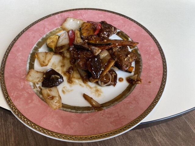 ゴロゴロした塊の牛ヒレ肉は言うまでもなく旨くて玉ねぎ、ズッキーニ、カボチャ、エリンギなどの野菜と炒められたメインは最高で、ガーリック炒飯との相性抜群です!